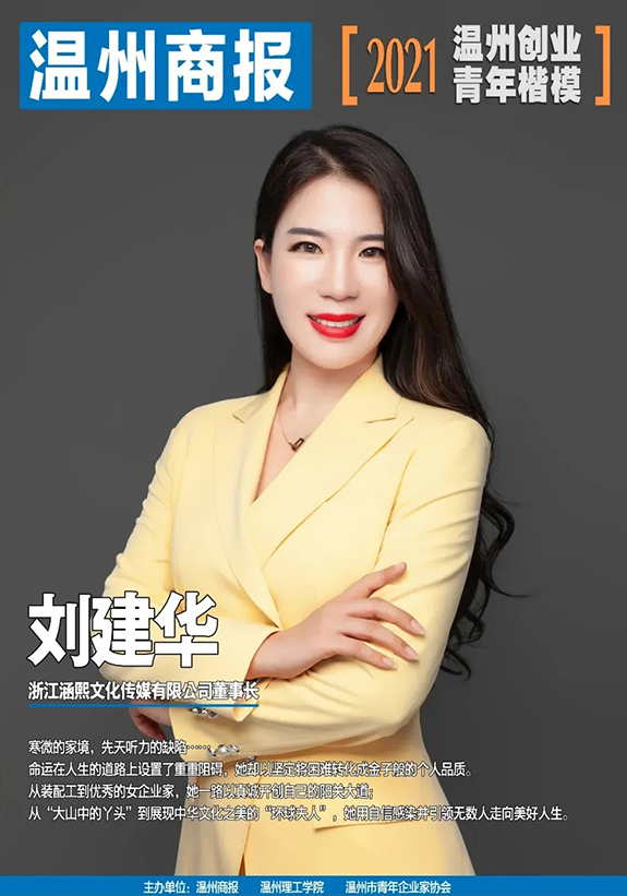 “天将降大任于斯人也,必先苦其心志,劳其体肤”,这句话极其贴合刘建华的人生之路。2007年,刘建华成立乐清涵尔电气有限公司。因其为人真诚守信用,又有了扎实的产品知识,还能吃苦耐劳,她赢得了客户和外协户的一致好评。2012年,刘建华创办“浙江涵尔塑料有限公司”。在创业过程中,刘建华不忘学习新技能,陆续获得了国家高级礼仪教练、国家高级形体仪态培训师等称号,同时也经常把学到的知识分享给身边的亲朋好友,经常去各高校和一些企业分享礼仪礼节知识。